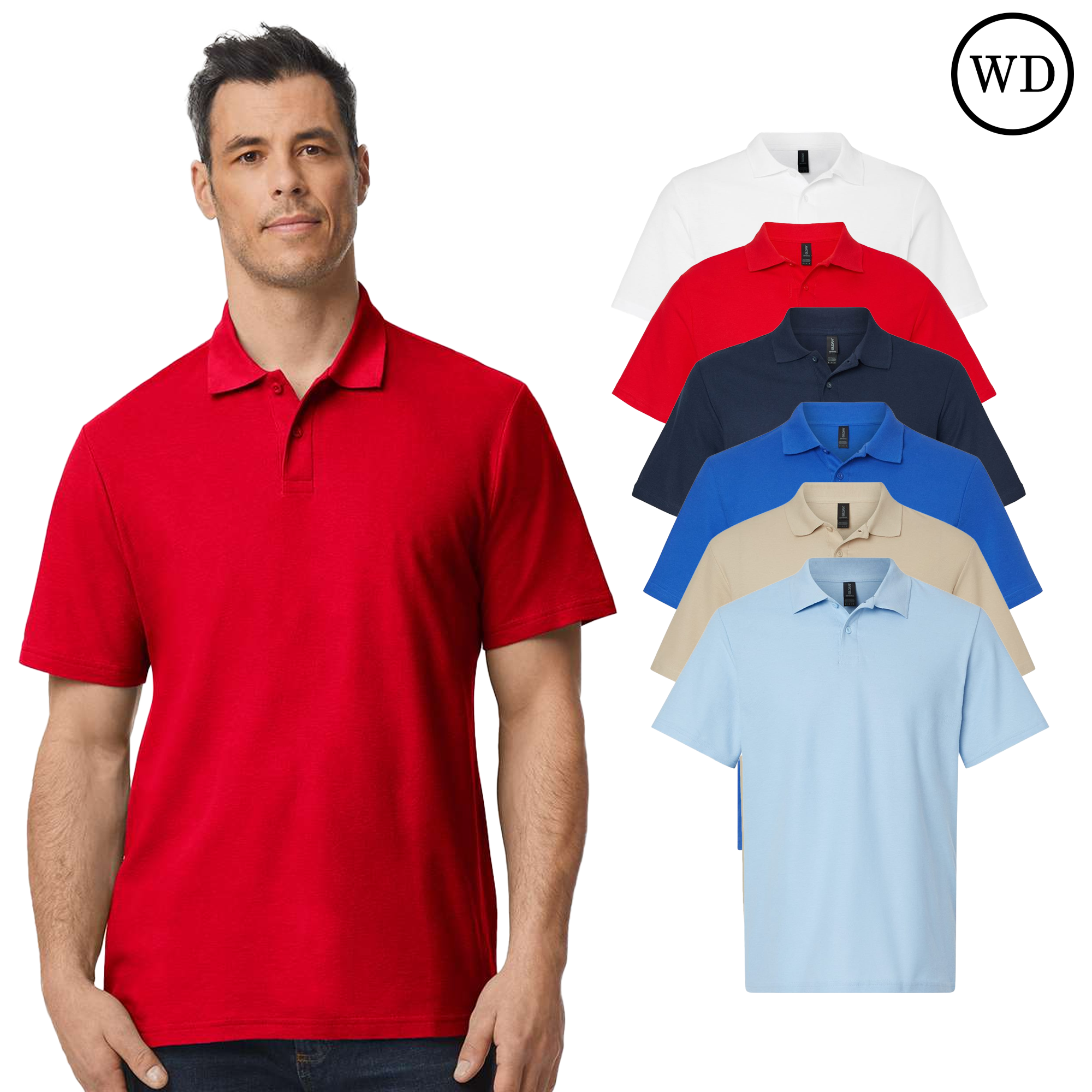 Gildan Men’s Softstyle Pique Polo comes in a 6-pack of bulk colors, perfect for work, school, events, or daily wear. Made from 100% ring-spun cotton (5.2 oz./yd²), these polos feel soft, smooth, and breathable. The fabric uses OEKO-TEX certified low-impact dyes and supports Better Cotton for more sustainable farming.