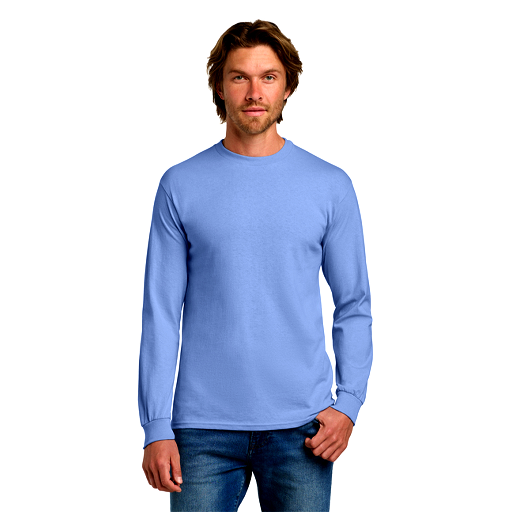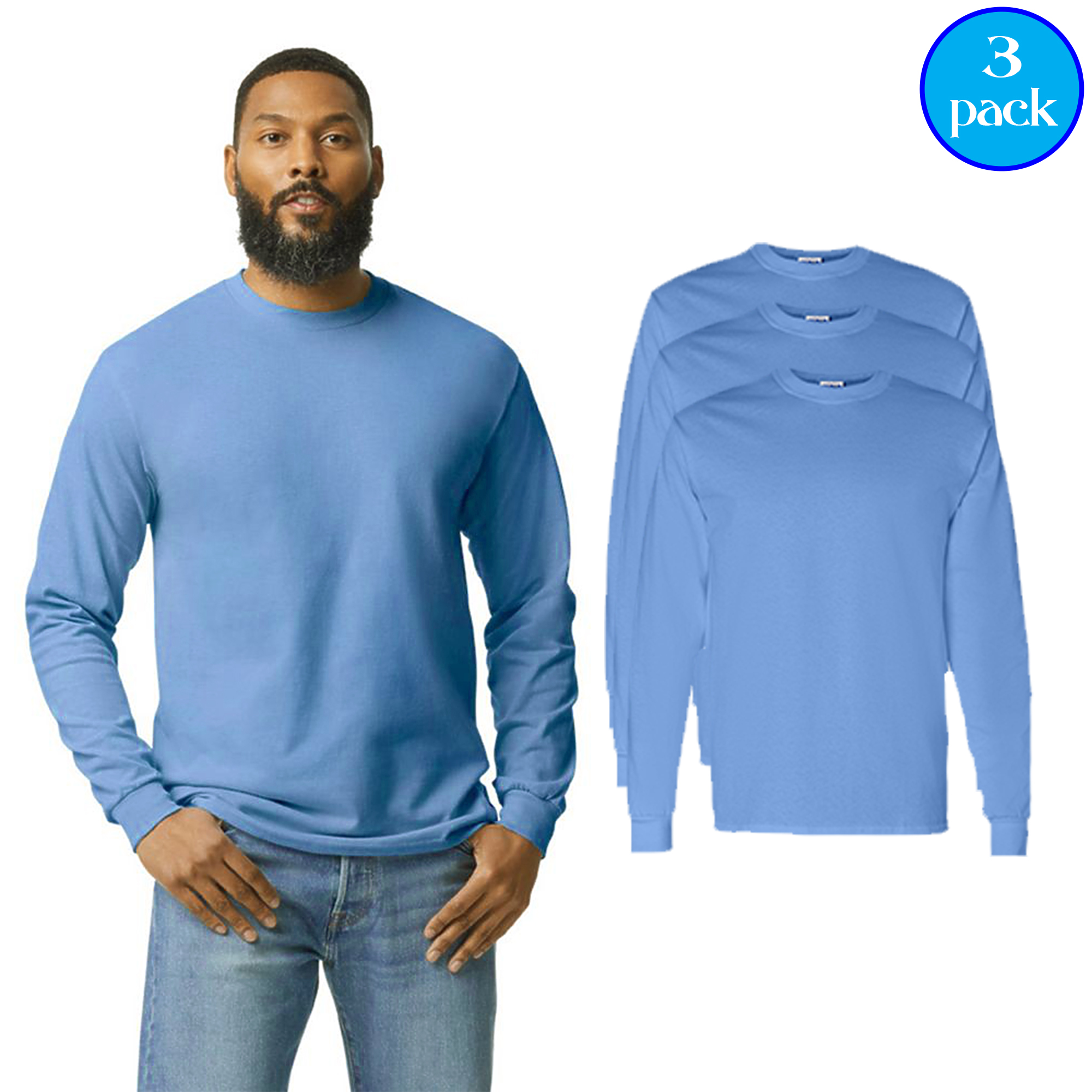 Gildan Men’s Heavy Cotton Long Sleeve T-Shirt, 3-Pack in Carolina Blue. Made from 100% soft U.S. cotton, these shirts offer lasting comfort, durability, and a smooth feel ideal for daily wear or printing. The classic fit provides a relaxed, timeless look, while the ribbed collar, rib cuffs, and taped neck and shoulders enhance comfort and shape retention. Each shirt includes a tear-away label for easy customization. Crafted with OEKO-TEX® certified low-impact dyes and made under the U.S. Cotton Trust Protocol, these tees combine sustainability with dependable quality. Available in sizes S–3XL, this 3-pack of Carolina Blue long sleeve shirts delivers the perfect mix of softness, strength, and style—great for layering, casual outfits, or custom designs.