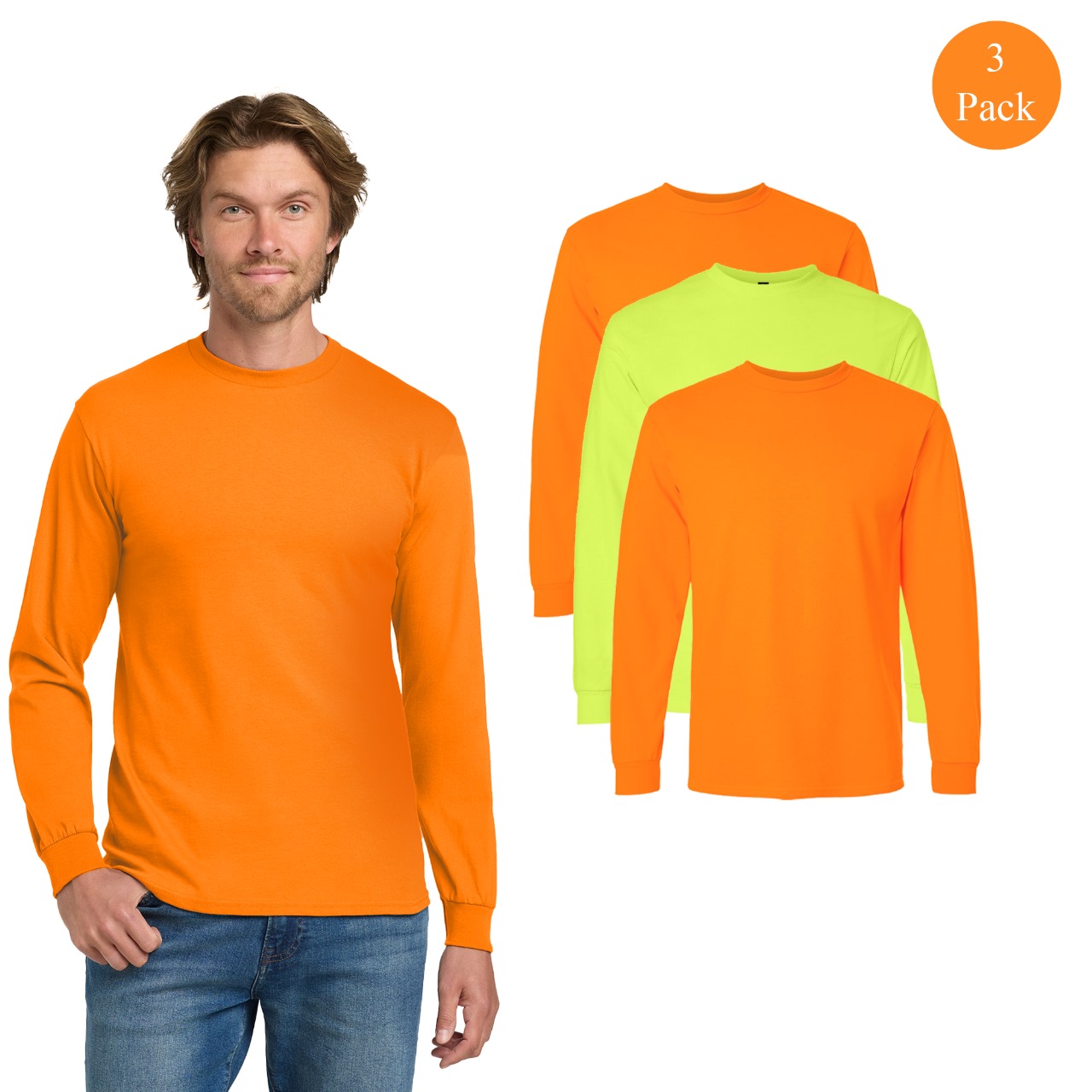 Gildan Men’s High Visibility Safety Green & Safety Orange Long Sleeve Work Shirts (3-Pack, Heavy Cotton Blend)