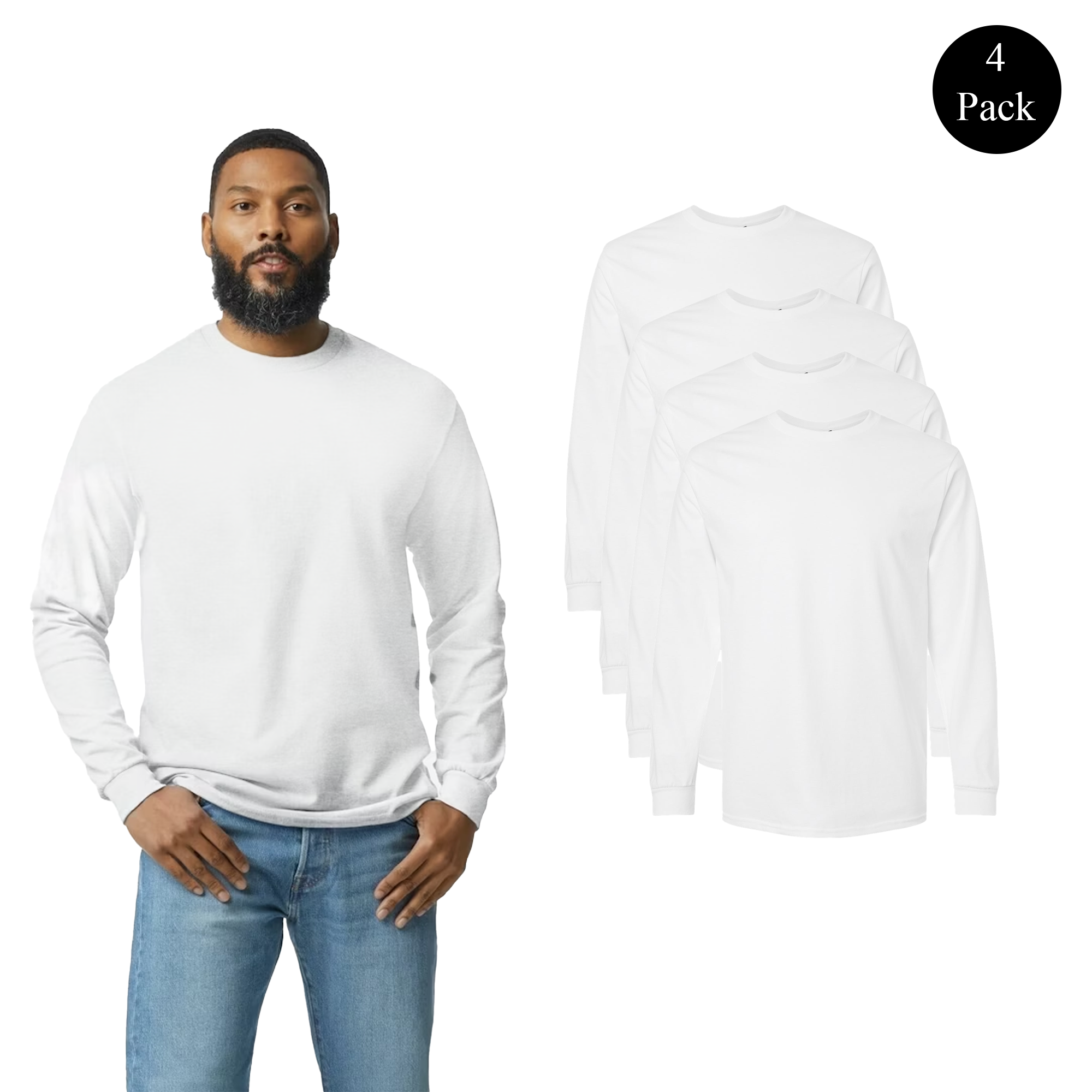 Gildan Ultra Cotton Long Sleeve T-Shirt for Men – 4 Pack in White. Made with heavyweight 6 oz./yd², 100% U.S.-grown cotton (18 singles), these shirts offer a soft, durable feel designed for long-term wear. The classic fit provides relaxed comfort without being too loose, making these long sleeves ideal for casual wear, work, layering, or printing.