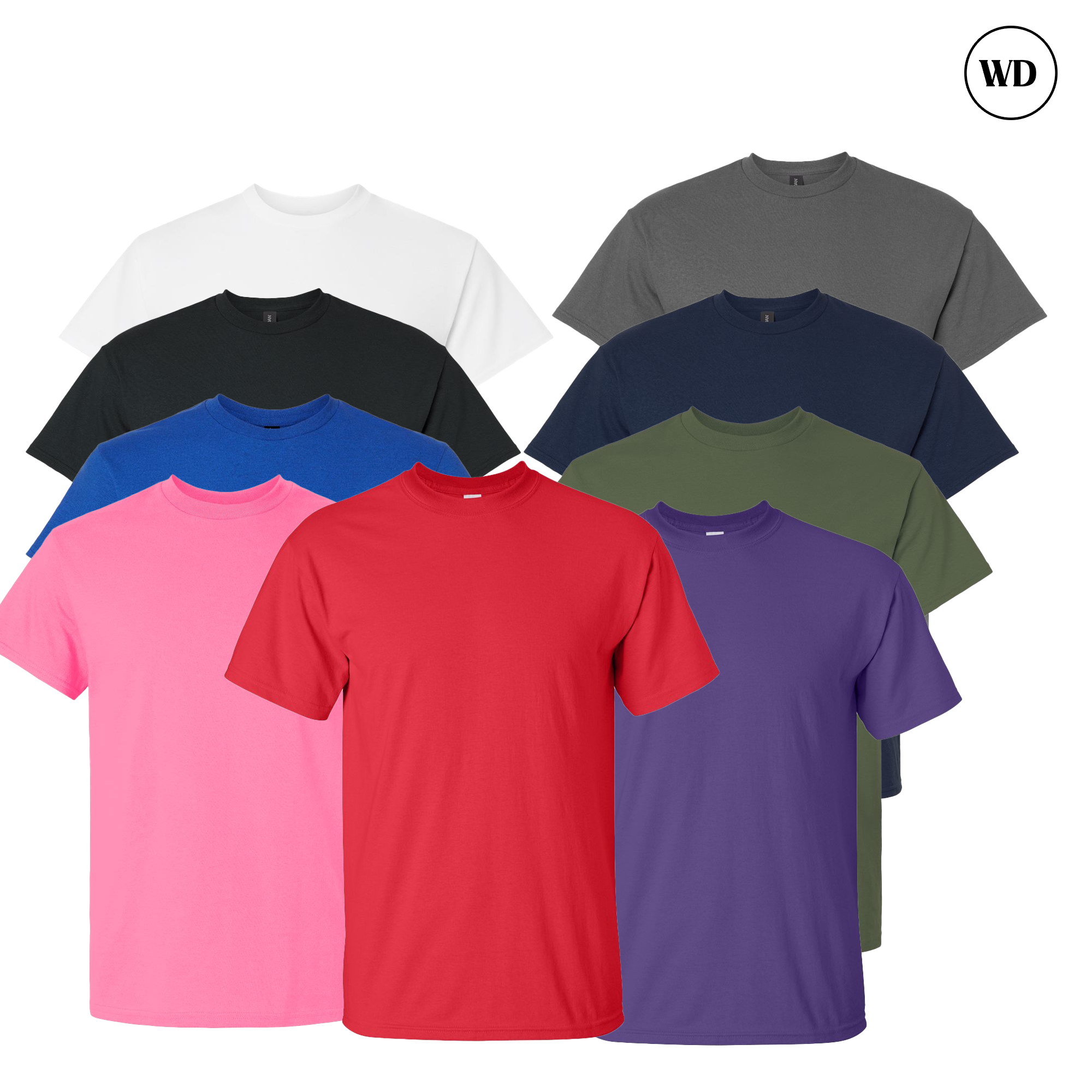 The Gildan Ultra Cotton Men’s T-Shirt 9-Pack offers heavyweight 6oz comfort with a classic fit. Most colors are 100% cotton, while Heather, Safety, Antique, Sport Grey, and Ash Grey feature quality cotton/poly blends. Perfect for daily wear, work, or custom printing, available in S–5XL with versatile multi-color