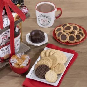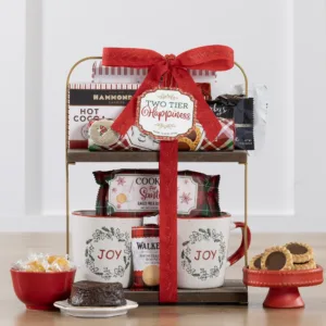 The Two Tier Happiness Chocolate and Candies Assortment is a beautifully curated holiday gift basket designed to spread cheer and delight. Featuring a reusable two-tier wood and metal tray, this gift set includes 2 – 12 oz. ceramic mugs, Hammond’s Hot Cocoa Mix, Butterscotch Hard Candies, Derby’s Coconut Flavored Choco Waffle, Gateau Celeste Chocolate Sauce Soufflé Cake, Hamilton House Tartlets with Chocolate Filling, Montreaux Napoleon Biscuits “Cookies for Santa”, and Walkers Pure Butter Shortbread Rounds. Each treat delivers gourmet flavor, perfect for festive celebrations, holiday parties, or cozy winter nights by the fire. Ideal as a Christmas gift basket, this assortment is gift-ready and beautifully packaged, making it an excellent choice for family, friends, or coworkers. With chocolate, candies, cookies, and cocoa, this holiday gift basket blends festive indulgence with elegant presentation, making it a top holiday gift for adults, teens, and chocolate lovers.