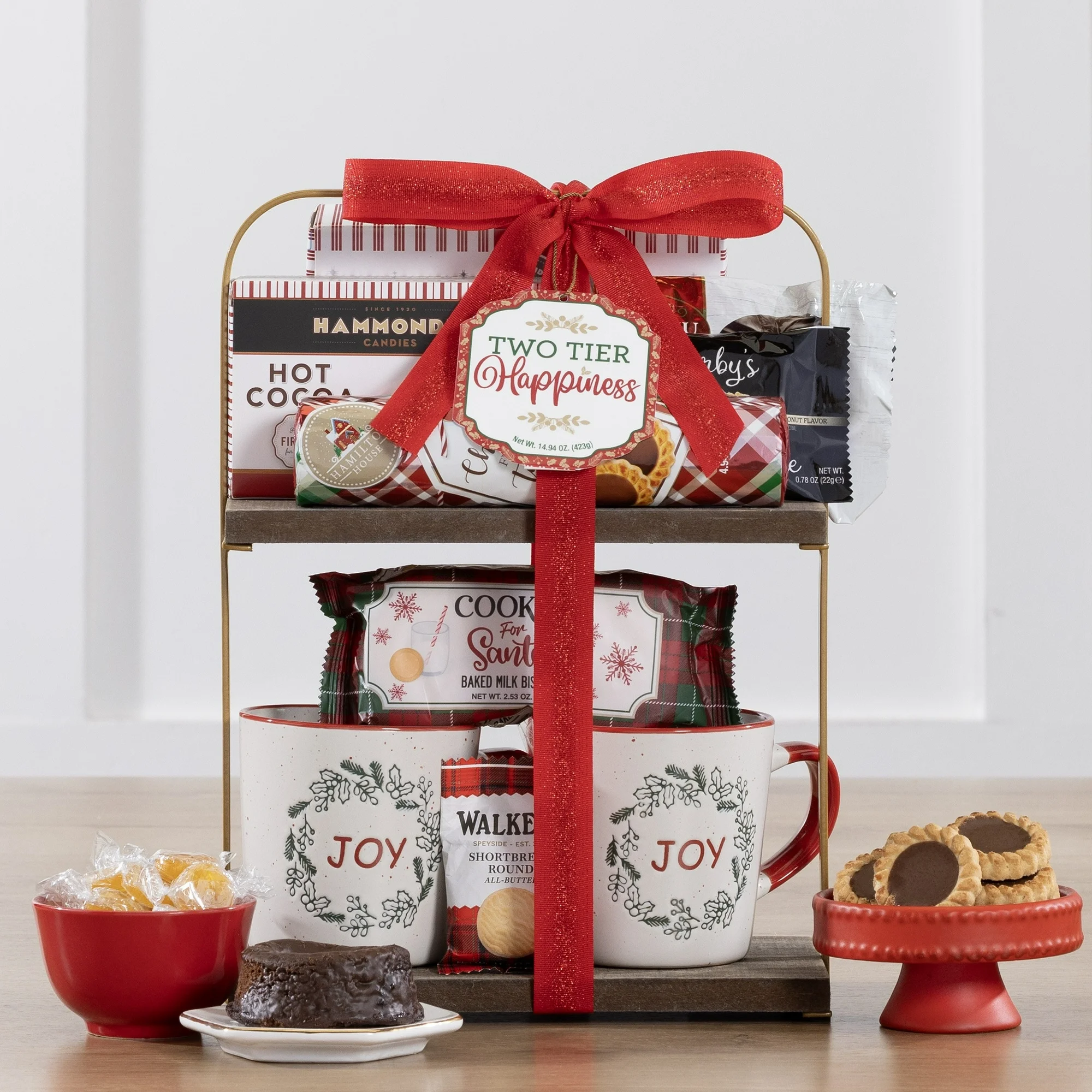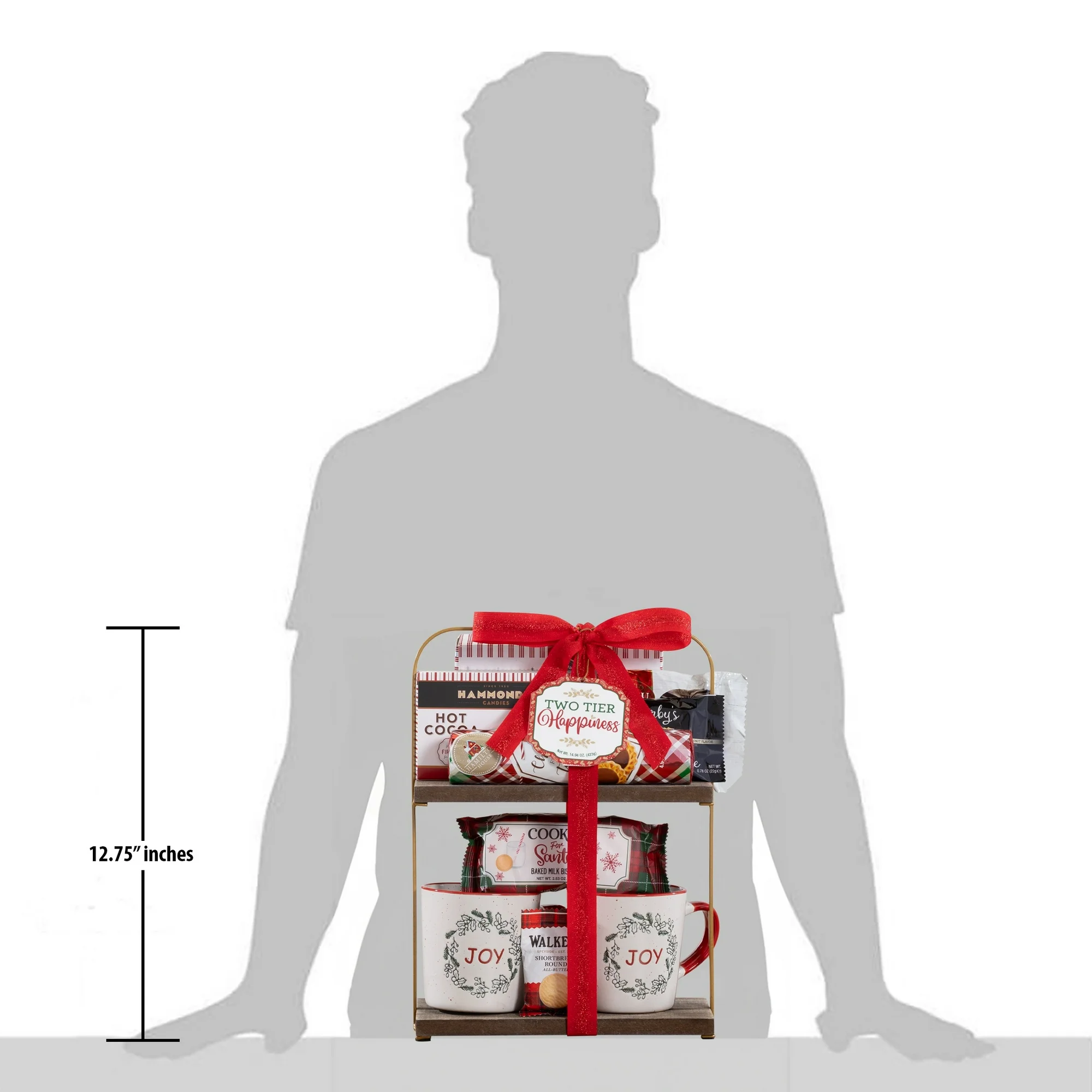 Celebrate the holidays with the Two Tier Happiness Chocolate and Candies Assortment Gift Basket, featuring a festive collection of chocolates, candies, cookies, and two ceramic mugs perfect for gifting or sharing cozy winter moments.