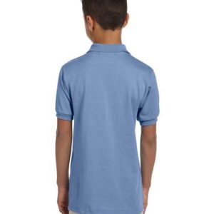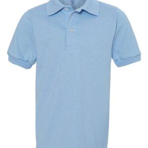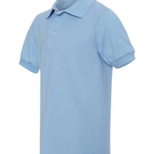 The JERZEES SpotShield Youth 50/50 Polo delivers dependable comfort, long-lasting wear, and added protection for active kids. Crafted from a soft and durable 5.4 oz./yd² 50/50 cotton-polyester jersey knit, this pre-shrunk polo maintains its shape and smooth feel wash after wash. The innovative SpotShield fabric helps repel water and most oil-based spills, making it a smart choice for school uniforms, sports, and everyday activities. Designed with a welt collar that resists curling, 1×1 ribbed cuffs, and a reinforced two-button placket with pearlized buttons, it pairs classic style with practical functionality. This polo also features a tagless label for added comfort and a CPSIA-compliant tracking label for safety assurance. Available in Light Blue and Oxford, in XL size, and sold as a single pack, it supports sustainable and socially responsible manufacturing standards.