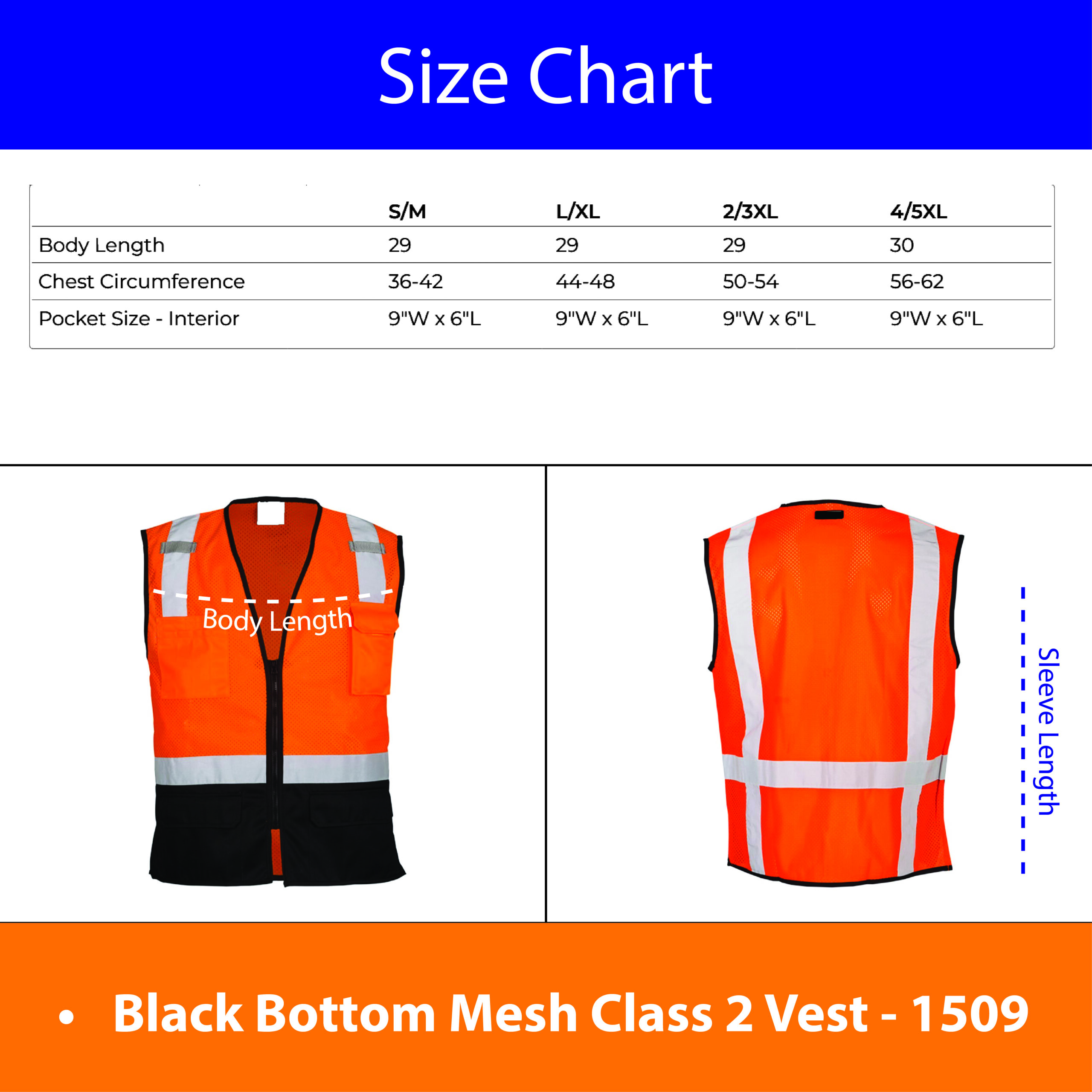 The vest features 2” high-visibility reflective material for enhanced safety and plastic zipper front closure (12″ zipper for S–M, 15″ zipper for larger sizes) for durability and ease of use. Designed for workers who need accessibility on the job, it includes: