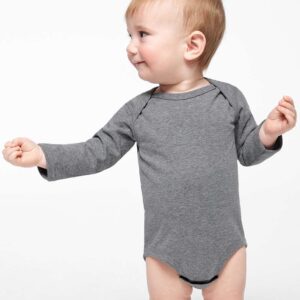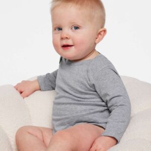 Rabbit Skins Infant Fine Jersey Long Sleeve Bodysuit, designed for softness, durability, and easy changing. Made from 4.5 oz 100% combed ring-spun cotton jersey, this long-sleeve baby bodysuit feels gentle on sensitive skin. The ribbed collar, sleeve cuffs, and leg cuffs ensure a snug fit, while the innovative snap tape closure at the leg opening makes diaper changes fast and effortless. Available in adorable colors including Pink, Natural, Red, Granite Heather, and Heather, this infant bodysuit pairs well with any outfit and is perfect for layering in cooler weather. The fabric blends include 90/10 cotton/poly Heather and 60/40 cotton/poly Granite Heather, offering softness with added durability. Each bodysuit includes a CPSIA-compliant tracking label, making it safe and parent-approved. Perfect for everyday wear, photos, gifting, or personalized printing, this baby onesie comes in multiple infant sizes NB, 6M, 12M, and 18M—providing long-term comfort as your baby grows.