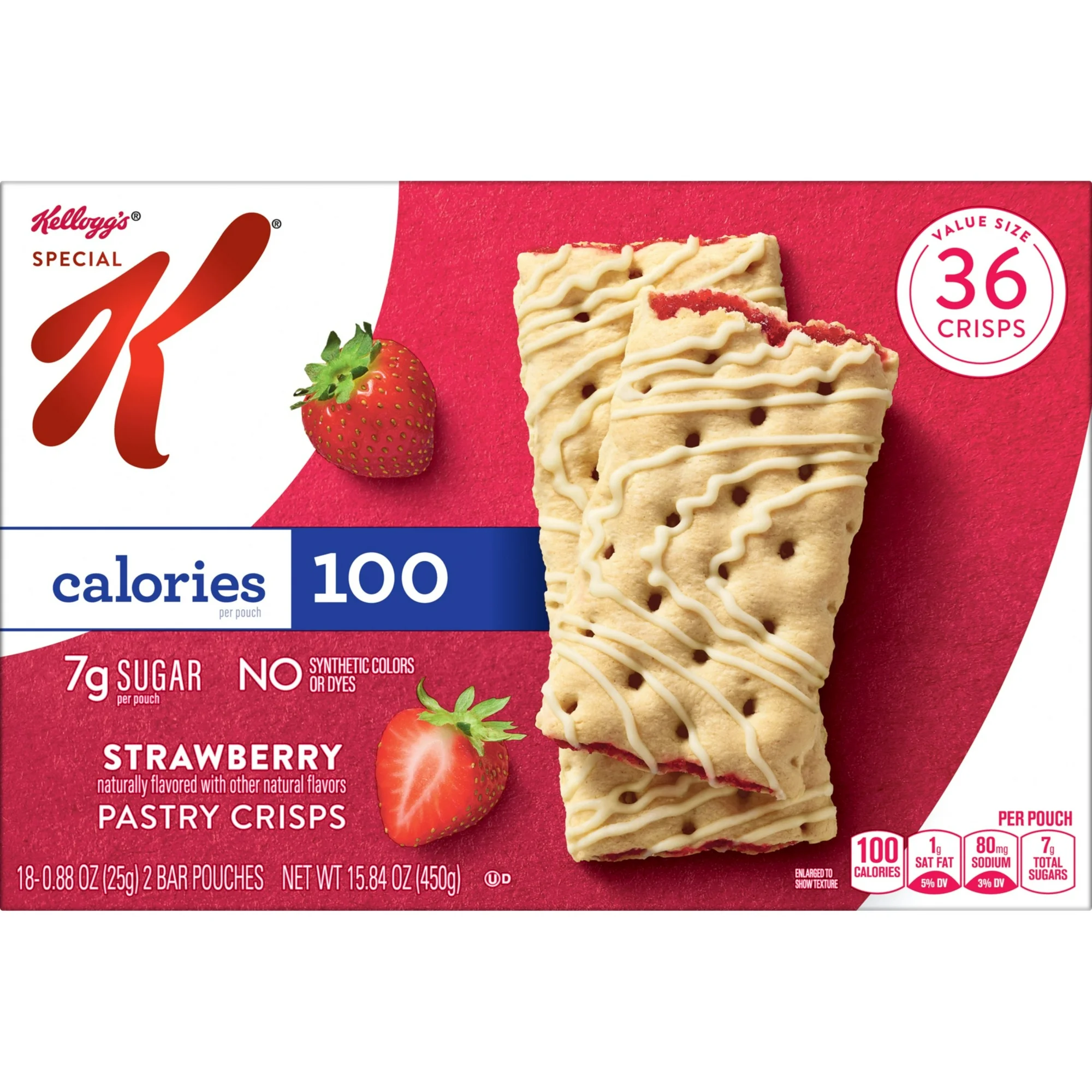 Enjoy a sweet, guilt-free treat with the Special K Strawberry Chewy Pastry Crisps—a light, flaky, dessert-inspired snack perfect for anytime cravings. Each serving contains only 100 calories, making it an ideal pick for a sweet snack at home, work, school, or on-the-go moments. These crisps feature a delicious blend of gooey strawberry-flavored filling, a crisp pastry crust, and a smooth icing drizzle for the perfect bite every time. This listing includes a 15.84 oz box with 36 pastry crisps (18 twin-packs), packaged for freshness and easy portability. With 7g sugar, no synthetic colors or dyes, and Kosher Dairy certification, it delivers taste without compromise. Perfect for lunchboxes, travel, office snacks, or a quick mid-day boost, this shelf-stable treat fits effortlessly into any lifestyle. Available in Single Pack and 3 Pack options for added convenience.